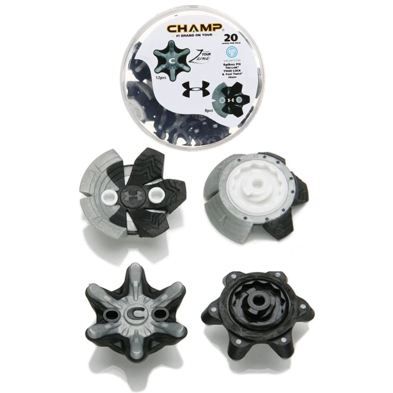 Champ Zarma Tour-UA RST / Under Armour disk pack contains 12 of the Zarma Tour spikes featuring 6 flexible anti-clogging comfort legs for superior traction and durability, plus 8 of the Under Armour RST spikes. Slim-Lok spikes fit Tri-Lok, Tour Lock, Fast Twist and Fast Twist 3.0 golf shoes. Fits all cleated Under Armour golf shoes.